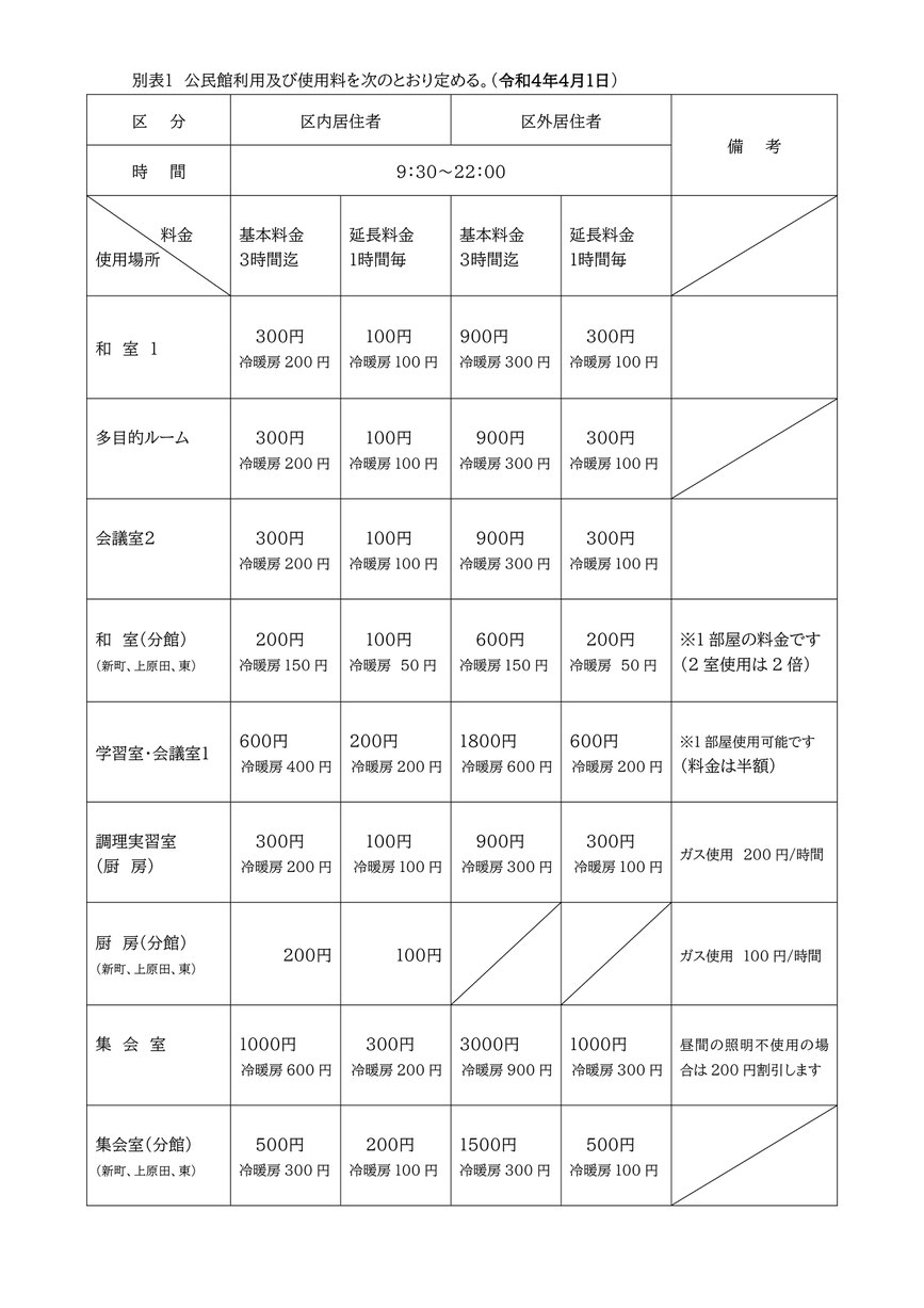 公民館利用及び使用料は次のとおりです (令和4年4月)
